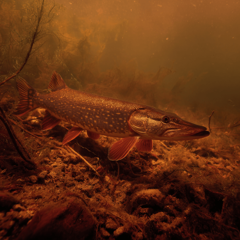 The Red Pike is a subspecies of common pike that has adapted to the reddish lakes high in tannins and iron, showing a distinct rust-red coloring.